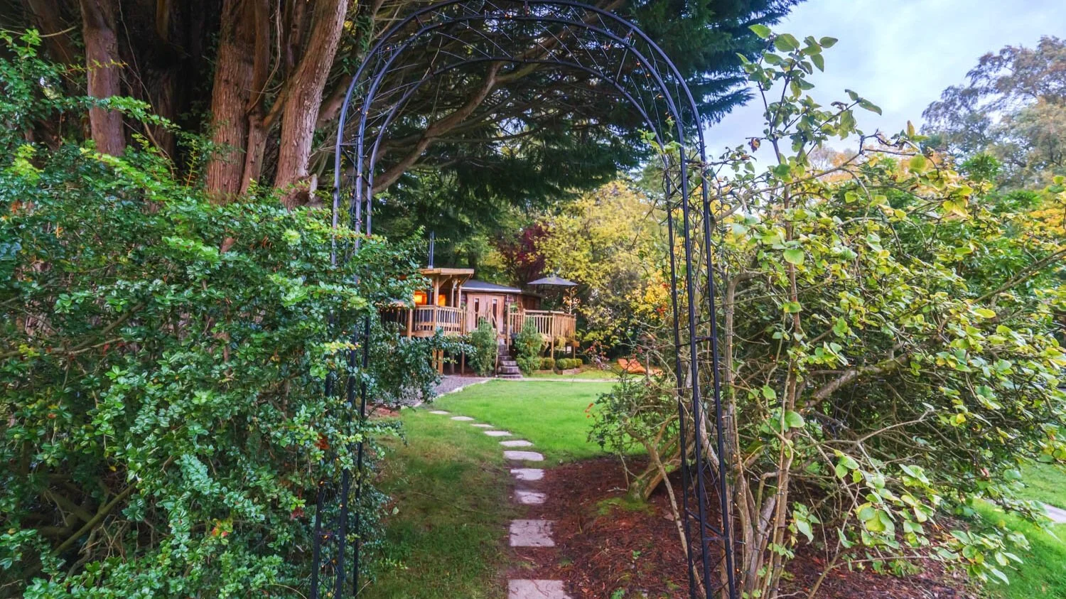 The Tree House is a solidly built wooden garden home, well heated and insulated, with all you might expect of a good quality hotel room. It is built on a large deck accessible via a few steps. The deck is a private area for the use of Tree House guests only, and it has all the comforts of a home under the sun or stars. Watch the garden light up as the sun goes down with tens of thousands of twinkly lights in the trees and on the pathways.